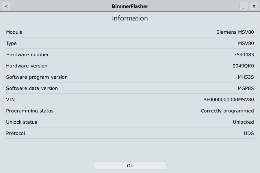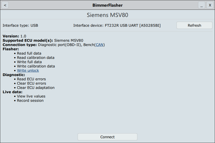 This BimmerFlasher module enables communication with Siemens MSV80 and MSV80.1 ECUs, which are used in BMW N51, N52K, and N52N engines